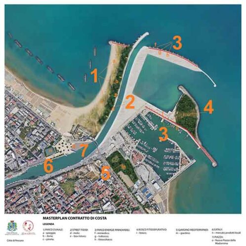 «Il progetto – dicono gli autori – riprende e sviluppa un accrescimento sabbioso in atto nell’area a mare posta a ridosso del molo nord del canale fluviale di Pescara: un cordone dunale che accoglie il reinsediamento di specie vegetali tipiche delle coste mediterranee. Interpretando questa nuova realtà naturalistica, il progetto consentirà di creare nel cuore della città una lunga e ampia spiaggia che si spinge fino alla diga foranea, caratterizzata dalla vegetazione tipica delle dune adriatiche e da una pineta di Pini d’Aleppo posizionata lungo il molo nord per tutta la sua estensione. La creazione di un’area con queste caratteristiche costituirà un elemento di resilienza e di bellezza naturale che andrà ad accrescere la qualità urbana della città».