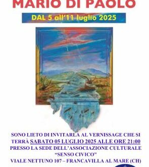 Francavilla al Mare. Il prossimo sabato 5 luglio, con inizio alle ore 21, ci sarà il vernissage della mostra di Mario Di Paolo, che durerà fino all’11 luglio. L’evento, che vedrà l’intervento di Don Gilberto Ruzzi, direttore dell’Ufficio Catechistico di Abruzzo-Molise e parroco a Miglianico, si terrà nella sede dell’associazione culturale “Senso civico”, presieduta da Nicolino Di Quinzio e situata in viale Nettuno 107 a Francavilla al Mare. La mostra sarà visitabile delle 20:30 alle 23:30.