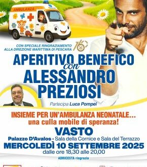 Vasto. Si terrà mercoledì 10 settembre, dalle ore 18.30 alle 20.00, l’aperitivo benefico di ADRICESTA con Alessandro Preziosi, in programma a Vasto, a Palazzo d’Avalos, nelle sale della Cornice e del Terrazzo. L’iniziativa si svolgerà in occasione dello spettacolo “Le memorie di Adriano” che vede protagonista l’attore e testimonial dell’associazione.