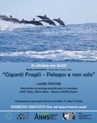Una iniziativa del Museo universitario e del WWF Chieti-Pescara nel quadro di “M’ammalia” “Giganti fragili. Pelagos e non solo” con l’esperta WWF Laura Pintore- Appuntamento venerdì 31 alle 10 nell’auditorium del Museo a Chieti. Ingresso libero
