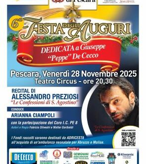 Pescara. Tutto pronto per la sesta edizione della “Festa degli auguri” del Tribunale di Pescara, in programma venerdì 28 novembre alle 20.30 al Teatro Circus di Pescara. L’edizione 2025 è dedicata alla memoria di Giuseppe Adolfo “Peppe” De Cecco e nasce dalla volontà del presidente del Tribunale di Pescara, Luigi Cirillo, di creare un momento di condivisione e solidarietà, rafforzando il legame con il territorio e sostenendo iniziative a favore dei bambini ospedalizzati e delle loro famiglie.