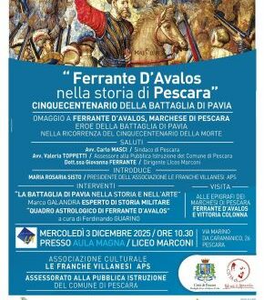 Pescara. Mercoledi 3 Dicembre 2025, nella ricorrenza del cinquecentenario della morte di Ferrante d’Avalos, Marchese di Pescara, si terrà presso il Liceo Marconi della città una conferenza del Prof. Marco Galandra di Pavia, esperto di Storia Militare, autore di un saggio sulla Battaglia di Pavia e nostra prestigiosa guida nella recente visita ai luoghi della battaglia e agli arazzi d’Avalos di Capodimonte in mostra al Castello Visconteo della città. L’incontro sarà preceduto dalla visita alle epigrafi celebrative di Ferrante d’Avalos e Vittoria Colonna che Pescara incise nel 1949 sui bastioni del Ponte Risorgimento, vestigia della fortezza di Carlo V.