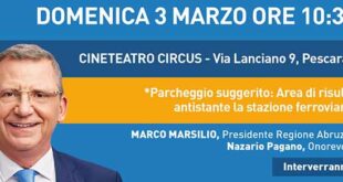 Pescara – Domenica prossima, 3 marzo, alle ore 10,30, nella sala del cinema Circus Luigi Albore Mascia, candidato al consiglio regionale per la provincia di Pescara, concluderà la sua campagna elettorale con un evento al quale prenderanno parte il candidato governatore Marco Marsilio, il coordinatore regionale di Forza Italia onorevole Nazario Pagano e il sindaco di Pescara Carlo Masci. Parteciperanno inoltre: Maria Tripodi, …