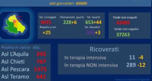Pescara – In Abruzzo, dall’inizio dell’emergenza, sono stati registrati 3197 casi positivi al Covid 19, diagnosticati dai test eseguiti nel laboratorio di riferimento regionale di Pescara, dall’Istituto Zooprofilattico di Teramo, dall’Università di Chieti e dal laboratorio dell’ospedale dell’Aquila. Rispetto a ieri si registra un aumento di 4 nuovi casi su un totale di 1718 tamponi analizzati (0.2 per cento di …