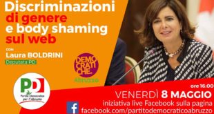Pescara – Venerdì 8 maggio dalle 16 si terrà in diretta Facebook sulla pagina del Partito Democratico regionale “Discriminazioni di genere e body shaming sul web”, l’evento delle Democratiche e del Pd abruzzesi a cui parteciperà la deputata del Pd Laura Boldrini. “L’iniziativa – spiega la deputata Stefania Pezzopane – nasce da una riflessione e da una mobilitazione delle deputate …